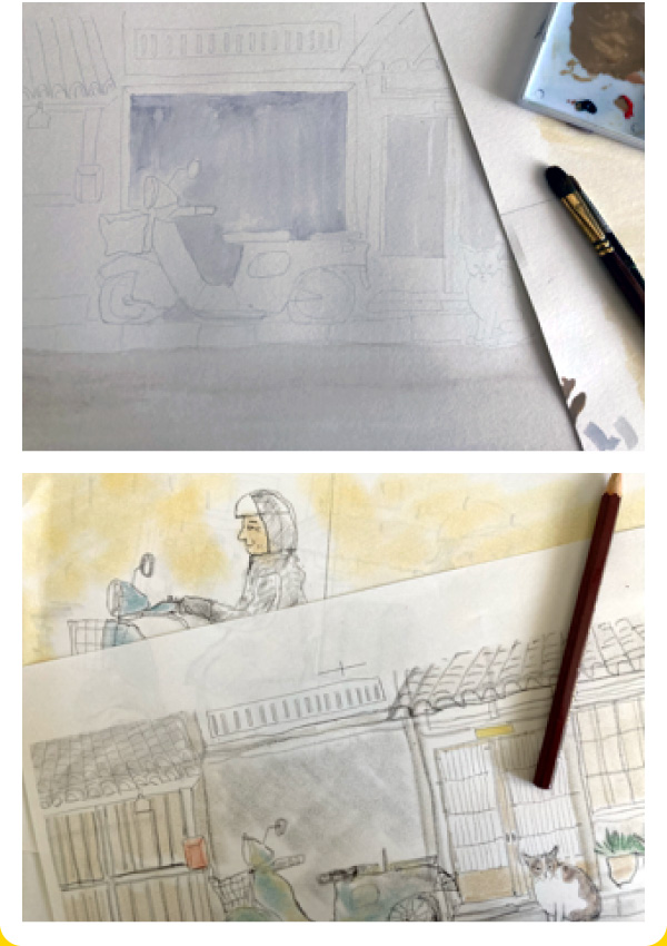 小さな子の目に映る景色を想像しながら絵を描くのが楽しかったです。ページをめくるたびに構図に変化をつけるように意識しました。